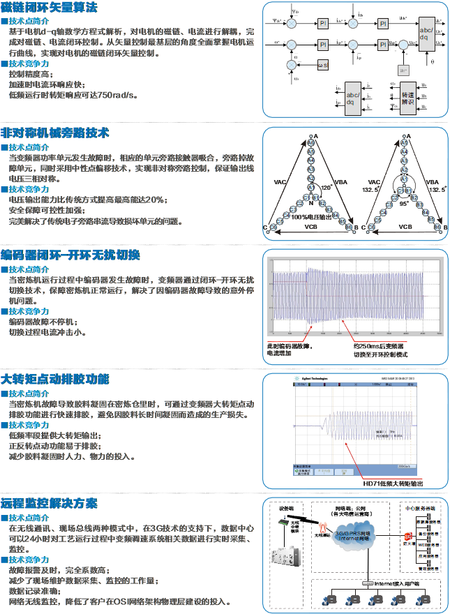 匯川技術致力于高性能高壓變頻器的探索,秉承對行業(yè)工藝的深入理解和對技術的極致追求,我們?yōu)橄鹉z行業(yè)帶來了全新的HD71密煉機專用高壓變頻器。HD71具備磁鏈閉環(huán)矢量算法、非對稱機械旁路技術、編碼器閉環(huán)-開環(huán)無擾切換、大轉矩點動排膠功能、遠程監(jiān)控解決方案等優(yōu)點,提高密煉機生產效率的同時降低能耗。大型傳動先鋒,共享卓越性能。